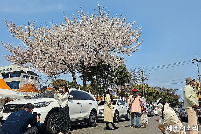 제주왕벚꽃 축제가 열렸지만 정작 꽃이 피지 않아 아쉬움을 자아내고 있다. 다만 나홀로 핀 나무가 입소문을 타고 상인들도 바가지 요금 차단에 나서면서 상춘객들을 유혹하고 있다.