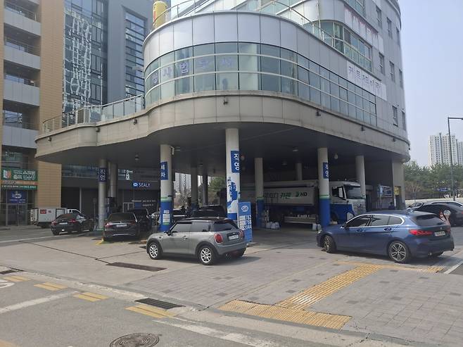 27일 낮 12시 세종 어진동의 한 주유소는 기름을 넣는 차들로 가득 차있었다.