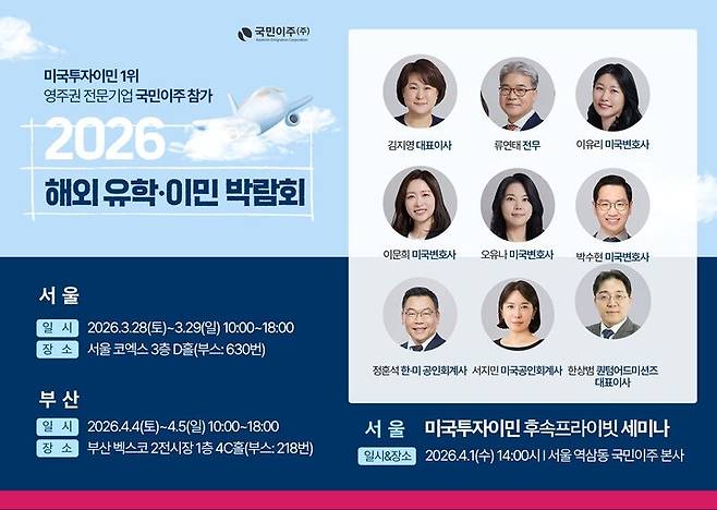 한편 미국투자이민 전문기업 국민이주㈜는 3월 28일부터 29일까지 서울 강남 코엑스에서 열리는 ‘2026 해외 유학·이민 박람회’에 참가해 미국투자이민을 중심으로 한 상담을 진행한다. 이번 박람회에는 이민법 전문 미국 변호사, 한·미 세법 전문가, 유학 컨설턴트, 부동산 및 투자 전문가 등이 참여해 법률·세무·교육·자산 관리까지 아우르는 상담을 제공할 예정이다. 또한 3월 28일에는 ‘EB-5 투자이민, 성공하는 프로젝트는 따로 있다’를 주제로 세미나가 열려 프로젝트 선택 기준과 리스크 관리 전략을 다룰 예정이다.