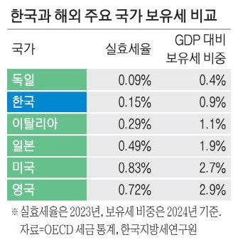 27일 경제협력개발기구(OECD) 세금 통계와 한국지방세연구원 등에 따르면 한국의 보유세 실효세율은 2023년 기준 0.15%다. 미국(0.83%), 영국(0.72%), 일본(0.49%) 등 주요 나라보다 낮다. OECD 평균인 0.33%의 절반에도 미치지 못한다. 실효세율은 시가 대비 세금을 뜻한다.