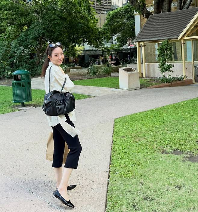 공개된 사진 속 정려원은 화창한 날씨 아래 호주 브리즈번의 거리를 배경으로 여유로운 시간을 즐기고 있다.