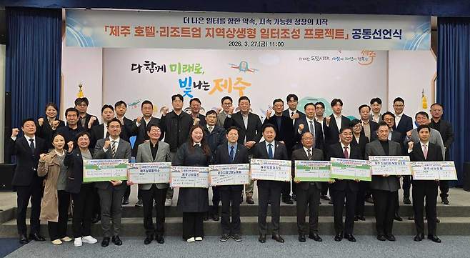 제주특별자치도와 제주상공회의소 제주지역인적자원개발위원회(공동위원장 양문석, 이하 제주인자위)는 27일 고용노동부 공모사업으로 선정된 '제주 호텔·리조트업 지역상생형 일터조성 프로젝트' 공동선언식을 개최했다.
