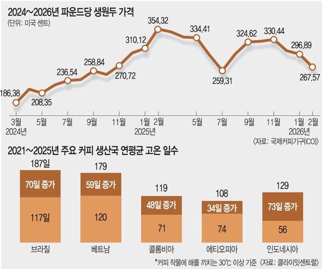 세계 원두 가격은 브라질과 베트남의 작황 부진, 엘니뇨에 따른 이상 기후 등으로 지난해까지 기록적인 상승세를 보였다. 생원두 가격은 2024년 3월 파운드(0.45㎏)당 186.38센트에서 2025년 2월 354.32센트로 상승해 사상 최고 수준을 기록했다. 최근엔 소폭 하락했지만 이는 일시적 현상이라는 분석이 나온다.