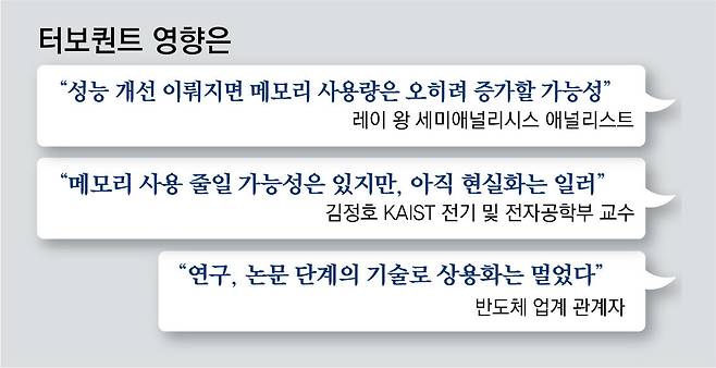 한진호 한국전자통신연구원(ETRI) 실장은 “메모리 수요 감소보다는 고성능 컴퓨팅 기반의 대규모 연산량이 늘어나는 방향으로 진화할 가능성이 높다”고 전망했다. 구글의 터보퀀트 연구에 참여한 한인수 KAIST 전기 및 전자공학부 교수는 “AI가 고용량 중심에서 고효율 중심으로 전환되면 AI는 더 저렴해지고 빠르게 확산하는 동시에 반도체 수요 역시 질적으로 고도화될 전망”이라고 밝혔다.