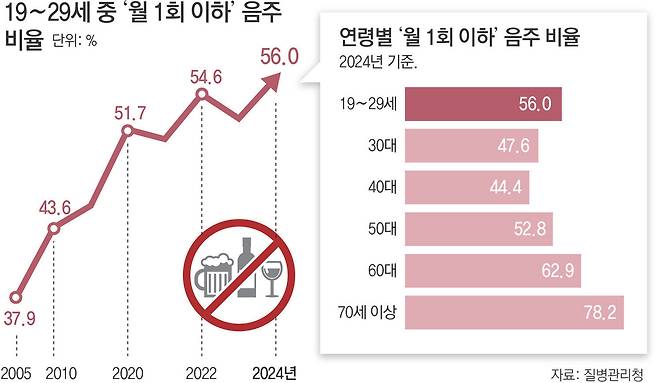 20대는 30세 이상 청장년층과 비교해도 술을 더 멀리하는 경향을 보인다. 2024년 기준 ‘월 1회 이하’ 음주율은 30대에서 47.6%였고, 40대 44.4%, 50대 52.8% 등이었다. 60대(62.9%)와 70세 이상(78.2%) 등 고령층을 제외하면 19∼29세 젊은 층(56.0%)이 가장 낮은 수준이다.