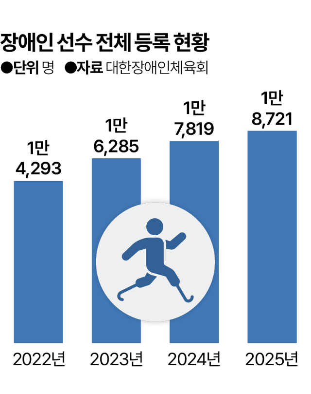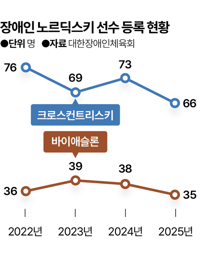다만 현실은 녹록지 않다. 대한장애인체육회에 따르면 바이애슬론과 크로스컨트리 등록 선수는 2022년 102명에서 지난해 101명으로 오히려 줄었다. 그런데 같은 기간 전체 장애인 선수 등록 인원은 1만4,294명에서 1만8,721명으로 약 31% 증가했다. 선수가 증가했어도 노르딕 종목의 관심으로는 이어지지 못한 것이다. 손성락 장애인 노르딕스키대표팀 감독은 “2018년 평창 패럴림픽 당시 신의현(BDH파라스) 선수가 금메달 1개, 동메달 1개를 따낸 뒤 등록 선수가 늘어날 것으로 기대했지만, 지원자는 없었다”며 “오히려 기존 선수들이 은퇴해 한동안 (선수단 구성에) 어려움을 겪었다”고 털어놨다. 그러면서 “이번 김윤지의 활약이 다음 대회 더 나은 선수단 구성으로 이어지길 기대한다”고 말했다.