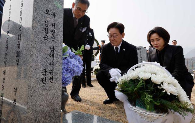 이재명 대통령이 27일 취임 후 첫 '서해수호의 날' 기념식 참석에 앞서 김혜경 여사와 함께 국립대전현충원을 찾아 제2현평해전과 연평도 포격, 천안함 피격 사건 전사자들 묘역에 참배하고 있다. 이 대통령은 이날 2023년 호우 피해 실종자 수색 중 사망한 고(故) 채수근 상병 묘역에도 들려 "많은 게 제자리를 찾아서 다행"이라고 말했다. 대전=왕태석 선임기자