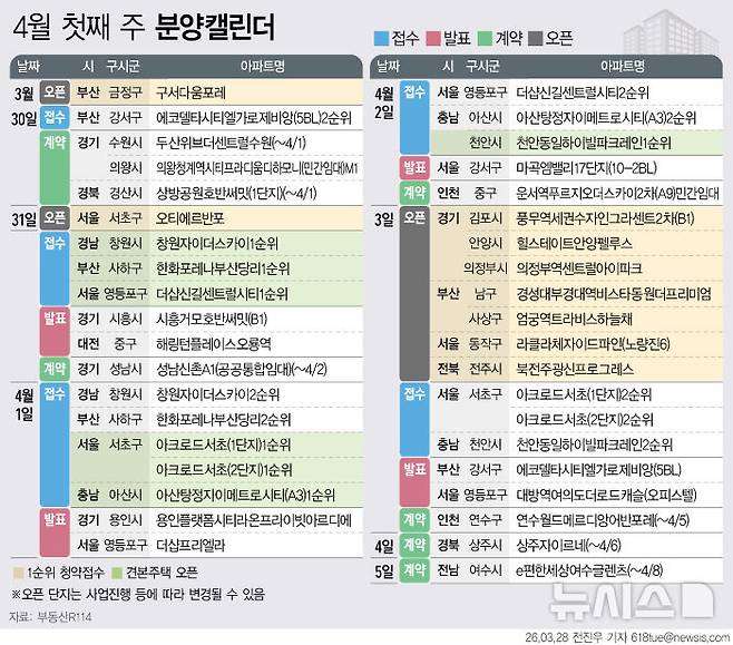 [서울=뉴시스] 28일 부동산R114에 따르면 4월 첫째 주에는 전국 7개 단지 총 6810가구가 분양을 시작한다. 이중 일반분양은 3784가구이다. (그래픽=전진우 기자)