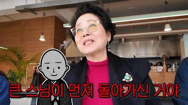 하지만 반전은 몇 달 뒤 일어났다. 정작 큰 스님이 먼저 세상을 떠나신 것이다. 선우용여는 "장례식에 가서 나 혼자 웃음이 나서 죽는 줄 알았다"며 "오죽하면 죄송하다고 사과까지 했다. 말이라는 건 정말 조심해야 하고 입을 잘 놀려야 한다"고 특유의 거침없는 입담으로 현장을 초토화했다.