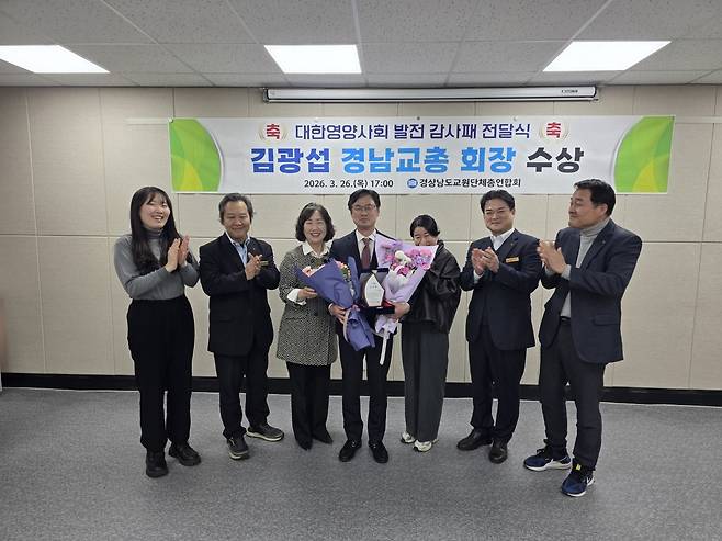 경남교총은 김광섭 회장이 대한영양사협회로부터 학교급식 교육 발전에 기여한 공로로 감사패를 받았다고 28일 밝혔다.