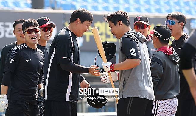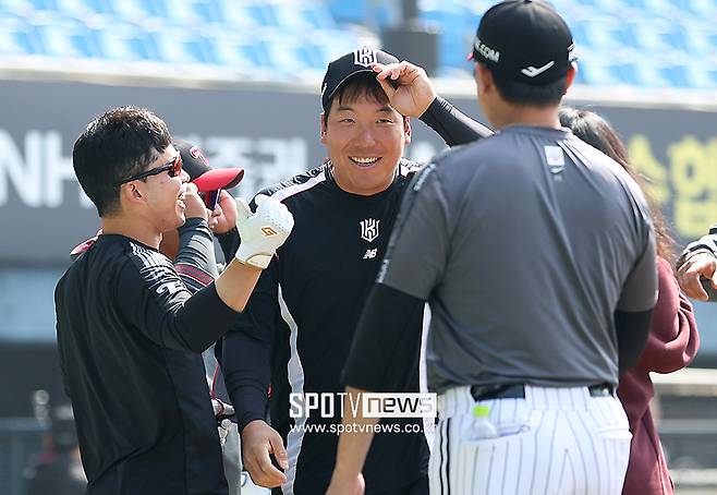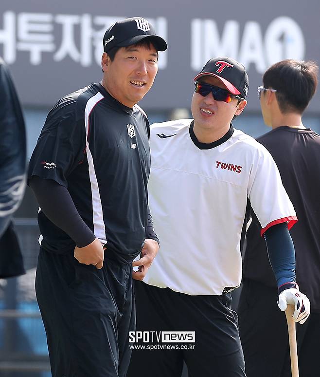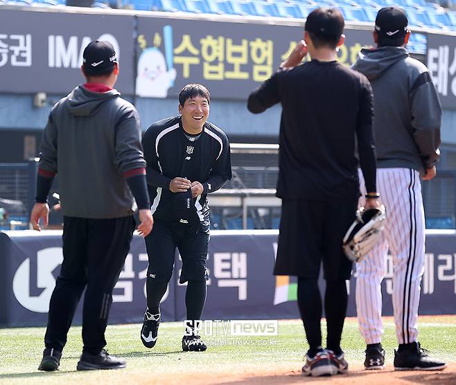 [스포티비뉴스=잠실, 곽혜미 기자] LG에서 KT로 이적한 김현수가 개막전을 앞두고 옛 동료들과 만나 반가운 인사를 나눴다.