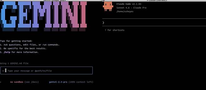 | ▲ 구글 GEMINI CLI와 클로드코드 실행 화면. 윈도우쉘 환경에서 실행된다. |