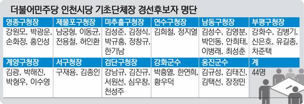 민주당은 인천에서 그 어느 때보다 치열한 경선을 예고하고 있다. 28일 현재 기초단체장 경선이 확정된 후보만 44명이다. 11명의 기초단체장을 뽑는 선거에 44명이 대기 중으로 평균 경쟁률이 4대 1이다. 여기에 경선 배제 통보를 받고 재심을 신청한 뒤 그 결과를 기다리는 후보가 5명이다. 재심 결과에 따라 경쟁률이 더 높아질 수 있다.