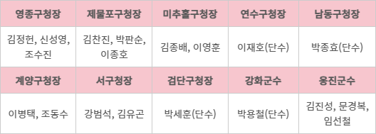 이번 선거에서 ‘초대’ 타이틀이 부여되는 기초단체장 선거구는 영종구·제물포구·검단구·서해구를 포함해 모두 4곳이다. 각 당에서 누가 초대 타이틀을 놓고 경쟁을 치를지 귀추가 주목된다. 현직 기초단체장 생존 여부도 관심이 가는 대목이다. 현직 기초단체장 가운데, 출마가 확정된 곳은 이번 선거는 연수구·남동구·강화군 등 3곳으로 모두 국민의힘 소속이다. 이들 3곳을 제외하면 현직도 경선을 치러야 한다. 경선을 치르는 현직 기초단체장은 국민의힘 5명, 민주당 1명이다.