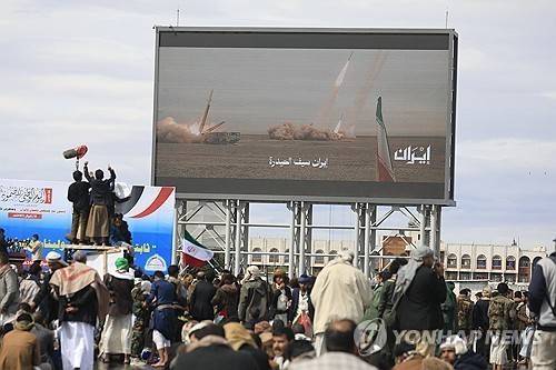 [2026년 3월 27일 예멘 사나에서 후티 반군 지지자들이 이란 지지 집회를 여는 가운데 전광판에 미사일과 이란 국기가 표시되고 있다. (사나 (예멘) EPA=연합뉴스)]