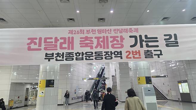 | ▲ 지하철 7호선 부천종합운동장역에 진달래 축제장을 알리는 안내 플래카드가 설치돼 있다. |