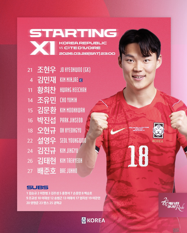 감기 기운이 있는 것으로 알려진 주장 손흥민, 왼쪽 발목 부상이 있는 이강인을 비롯해 이재성과 옌스 카스트로프 등은 벤치에서 경기를 시작했다. 주장 완장은 김민재가 찼다.