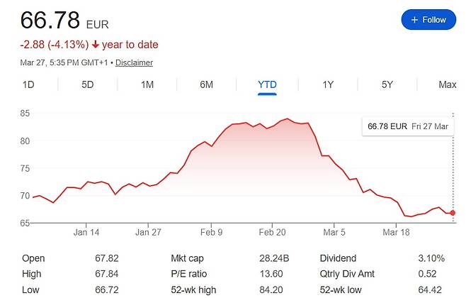 프랑크푸르트 증시에 상장된 헨켈의 주가는 지난 27일 1.56% 하락하며 66.78유로에 마감했습니다. 올해 들어서는 4.13% 내렸습니다.