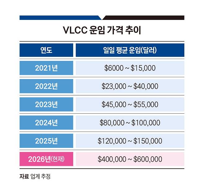 이렇다 보니 VLCC의 몸값도 부르는 게 값이라는 말이 나올 만큼 비싸졌다. 실제로 장금상선은 최근 글로벌 정유사와 중동 노선을 운항하는 VLCC 용선 계약을 진행하며 하루 용선료로 80만 달러(약 11억7872만원)를 제시한 것으로 알려졌다. VLCC의 대표 노선인 사우디아라비아~중국 상하이 구간의 경우 편도 항해(26일 기준) 운임이 약 305억원에 달하는 것으로 전해진다. 선박 한 척이 한 번의 운항만으로 천문학적인 수익을 벌어들이는 셈이다.