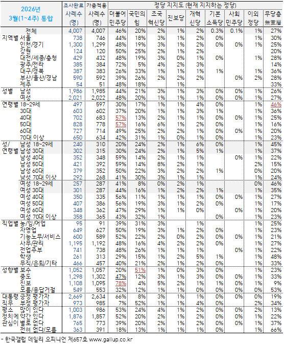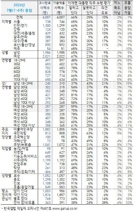 3월27일 발표한 한국갤럽 정례 여론조사를 보겠습니다. 한국갤럽은 매달 마지막 주에 월간 통합자료를 공개합니다. 월 단위로 데이터를 통합하면 표본 수가 4천명으로 늘어나 지역별, 연령별 추이를 비교적 안정적으로 볼 수 있습니다.