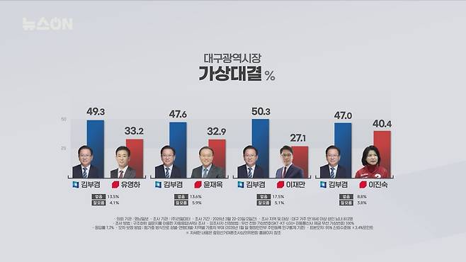이 결과에 민주당 대구시당은 시장 선거 뿐만 아니라 기초, 광역 의원 선거 등에도 좋은 영향이 있을 수 있다는 분위기이고요. 공천 내홍을 겪고 있는 국민의힘은 대구도 뺏기나 하는 우려를 하고 있는데요. 다만, 이런 결과가 '보수 결집'을 유인할 것이라는 기대를 하고 있습니다. 다만, 일부에서는 다자대결 시 김 전 총리의 지지도보다 다른 국민의힘 예비후보들의 지지도 총합이 더 높다면서, 비관적으로 볼 필요는 없다는 분석도 있는데요.