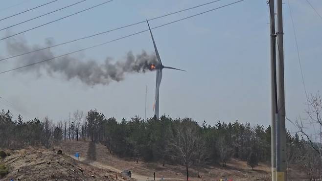 지난 3월 23일, 영덕풍력발전단지 19호기에서 불이 났습니다. 지상에서 80m 높이에 있는 풍력발전기 날개 쪽에서 시작된 불이 발전기 터빈이 있는 기계실로 옮겨 붙었습니다. 화재 이후 발전기 날개가 부러져 떨어졌고 불이 인근 야산으로 번져서 진화 작업을 벌였습니다. 이 화재로 정비업체 직원 3명이 숨졌습니다.