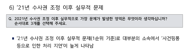 이재명 정부 국무총리실 산하 검찰개혁추진단은 형사사법 실무에 종사하는 전문가들을 대상으로 한 조사 결과를 지난 2월에 발표했다. 조사 결과 대부분의 전문가 그룹이 문재인 정부의 수사권 조정 이후 나타난 "'사건 핑퐁'으로 인한 처리 지연" 을 심각한 문제라고 지적했다. "수사 품질 저하"와 "경찰의 불송치 결정 및 통제 절차" 역시 심각한 문제로 지적됐다. 그룹 별로 의견이 조금씩 달랐지만 '사건 처리 지연', '수사 품질 저하', '경찰 수사에 대한 사법 통제'가 심각한 문제라는 점에는 대다수 전문가들이 의견을 같이 했다.