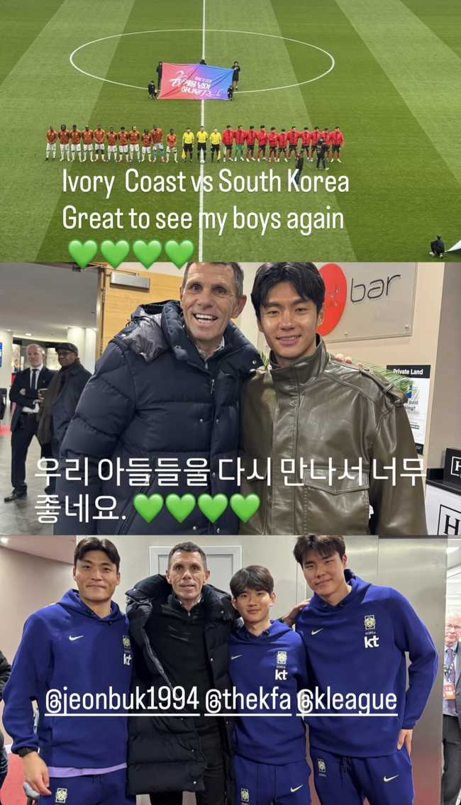 포옛 감독은 대표팀에 소집된 박진섭, 김진규, 송범근과 함께 사진을 찍었다. 이번 A매치에서는 소집되지 못한 전진우와도 만나 사진을 남겼다. 포옛 감독은 개인 SNS를 통해 사진들을 게재하며 한글로 “우리 아들들을 다시 만나서 너무 좋네요”라는 캡션과 함께 녹색 하트 이모티콘을 덧붙였다.
