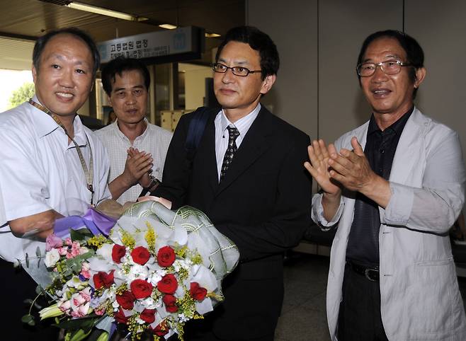 | ▲ 1980년대에 간첩으로 몰려 억울한 옥살이를 했던 재일교포 이종수씨가 2010년 7월 15일 서울고법 형사10부에서 열린 재심재판에서 무죄판결을 받고 밖으로 나와 지인들로부터 꽃다발을 받고 있다. |