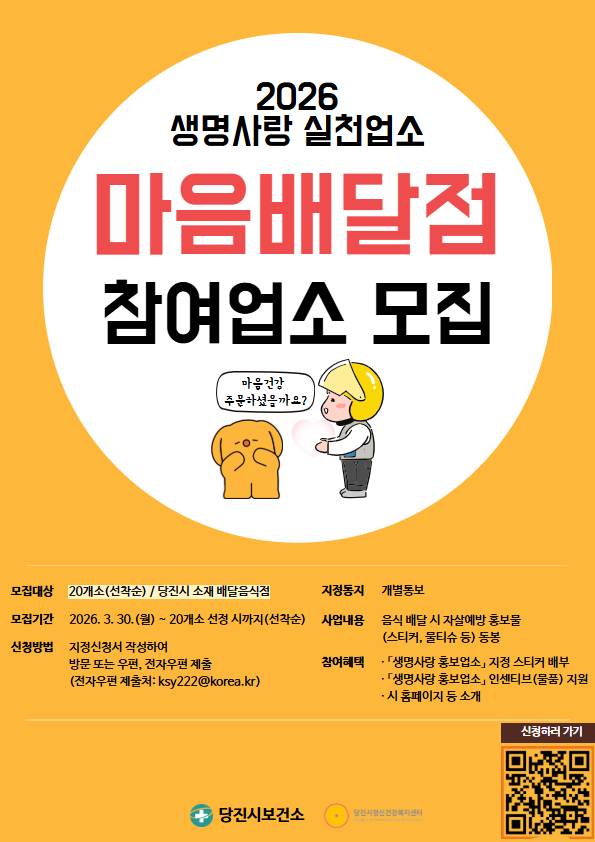 [충청타임즈] 충남 당진시는 지역사회 내 자살 예방 안전망 구축과 1인 가구의 정신건강 위기 극복을 위해 오는 30일부터 2026년 '마음배달점' 신규 참여 업소를 모집한다고 27일 밝혔다.