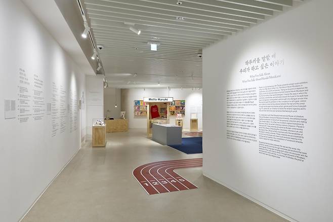 28일 찾은 전시장에는 음식, 위스키, 재즈, 달리기, 티셔츠 등 작가의 작품에 자주 등장하는 요소들이 모형과 자료 형태로 배치돼 있었다. ‘콜라를 부은 핫케이크’도 전시장 한편에 음식 모형으로 놓였다. 장편 ‘태엽 감는 새 연대기’에서 실직 후 집에 머물던 오카다 도루가 혼자 만들어 먹는 스파게티, ‘노르웨이의 숲’에서 와타나베와 미도리가 처음 만날 때 먹은 버섯 오믈렛과 완두콩 샐러드도 재현돼 있다.