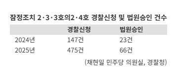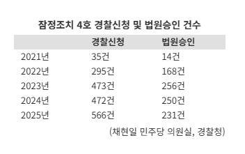 반면 경찰이 신청하고 법원이 승인하는 잠정조치 가운데 유치장 구금(4호) 등 비교적 강도가 높은 조치는 인용률이 상대적으로 낮은 수준에 그친 것으로 나타났다. 실제 잠정조치 4호의 경우 연도별 인용률이 2021년 40%, 2022년 57%, 2023년 54.1%, 2024년 53%, 2025년 40.8%로 집계됐다.