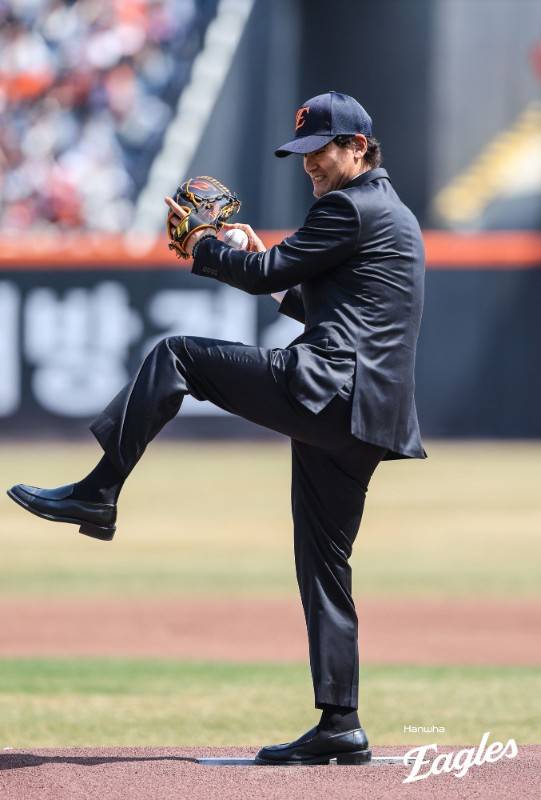'코리안 특급' 한국 야구 레전드 출신 박찬호가 검은 정장을 입고 시구를 한 후 비하인드를 전했다.