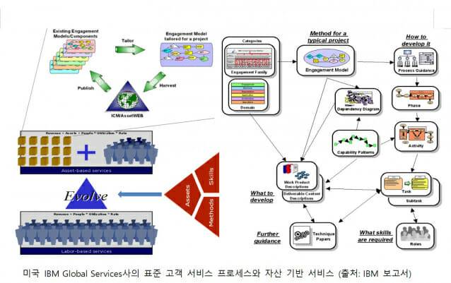 아래 그림은 2000년대 초 IBM Global Services의 고객 서비스 표준 프로세스를 보여준다. 서비스 라인(Engagement Family)별로 서비스 프로세스, 단계, 활동, 담당 역할, 적용 방법론(Capability Pattern), 산출물을 모두 표준화했다. 한편 프로젝트 산출물과 경험을 자산화하여 재사용함으로써 소위 Labor-Based Service(LBS)에서 Asset-Based Service(ABS)로 전환하였고, 이를 통해 원가, 납기, 수익을 크게 개선했다.