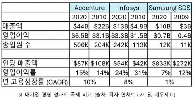 참고로 한국의 SI 대기업들은 액센츄어 같은 글로벌 SI 기업들과 판이하게 다른 비즈니스 모델을 가지고 있기 때문에 기업의 국제 경쟁력과 성장률, 이익률이 매우 저조하다. 아래 표에서 보듯이, 액센츄어와 인도 인포시스(Infosys)의 영업이익은 각 15%와 25%, 고용 성장률은 8%와 10%인데, 한국 최대 SI 기업인 삼성SDS는 각 7%와 1%에 불과하다. 기업의 경쟁력을 시사하는 기업 시가총액을 연간 매출액으로 나눈 지표 P/S(Price/Sales) 비율도 2026년 액센츄어는 1.8, 인포시스는 3.0, 삼성SDS는 0.9로 큰 차이를 보이고 있다.