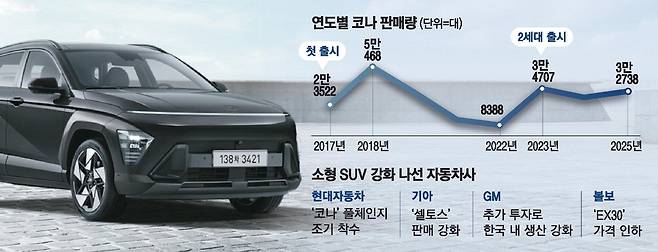 지난해 약 5만6000대가 판매된 기아 '셀토스'는 올해 1월 4686대, 2월 4512대가 판매되며 코나를 앞섰다. 최근 가격 인하를 단행한 볼보 소형 전기 SUV 'EX30'은 2주 만에 약 2000대 판매됐다.