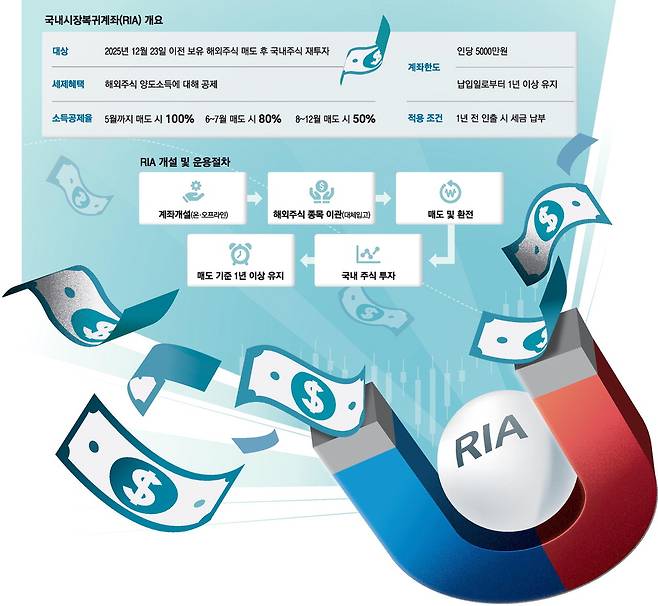 # 지난해 말 은퇴한, 서울 동작구에 거주하는 김 모씨(62)는 최근 주거래 증권사를 통해 국내시장 복귀계좌(RIA)에 가입했다. 김씨는 지난 몇 년 동안 높은 수익률을 안겨줬던 미국 주식 일부를 이 계좌로 이관할 예정이다. 김씨는 "이미 충분한 수익을 냈고 단기 급등으로 추가 상승이 쉽지 않다고 봐 수익 실현(익절)한 뒤 국내 주식과 고배당주 상장지수펀드(ETF) 등에 활용할 계획"이라며 "절세 및 수수료 절감 효과가 크고 은퇴 이후 미국 시장에 추가 투자할 여력도 크지 않아 내린 결정"이라고 설명했다.