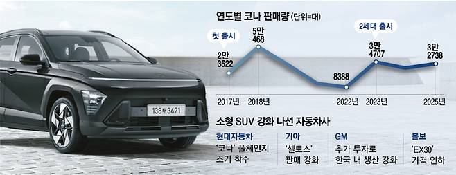 지난해 약 5만6000대가 판매된 기아 ‘셀토스’는 올해 1월 4686대, 2월 4512대가 판매되며 코나를 앞섰다. 수입차 브랜드 역시 내연기관·전기차 할 것 없이 소형 SUV 라인을 강화하며 시장 공략에 힘을 주고 있다. 최근 가격 인하를 단행한 볼보 소형 전기 SUV ‘EX30’은 2주 만에 약 2000대 판매됐다.