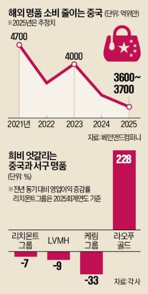 29일 글로벌 명품업계에 따르면 라오푸골드의 작년 매출은 전년 대비 221% 증가한 273억위안(약 5조9000억원)이다. 중국 내 에르메스 매출을 추월했다. 전체 명품 소비의 30% 안팎을 차지하던 중국 부유층이 변심하자 전통적인 명품 브랜드의 실적은 나빠졌다. 구찌 모회사인 케링그룹의 작년 글로벌 매출은 전년 대비 13% 감소했다. 같은 기간 LVMH 영업이익은 9% 줄었다.