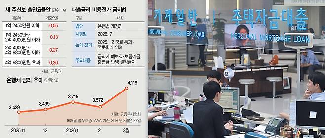업계에서는 은행권에서 현재 6억 원, 4억 원까지 주담대를 받을 수 있는 수도권 15억 원 이하, 15억~25억 원 미만 아파트 실수요자가 이번 요율 체계 개편의 영향이 클 수 있다는 전망이 제기된다. 금융 당국은 이번 주 다주택자 대출 만기 연장 규제와 함께 고강도 가계대출 총량 목표를 내놓을 예정이라 당분간 내 집 마련 문턱은 높아질 것으로 보인다. 금융계의 관계자는 “이란 전쟁 여파를 고려하면 당분간 대출금리 인하가 쉽지 않을 것”이라며 “서민들의 부담이 커질 수밖에 없다”고 설명했다.