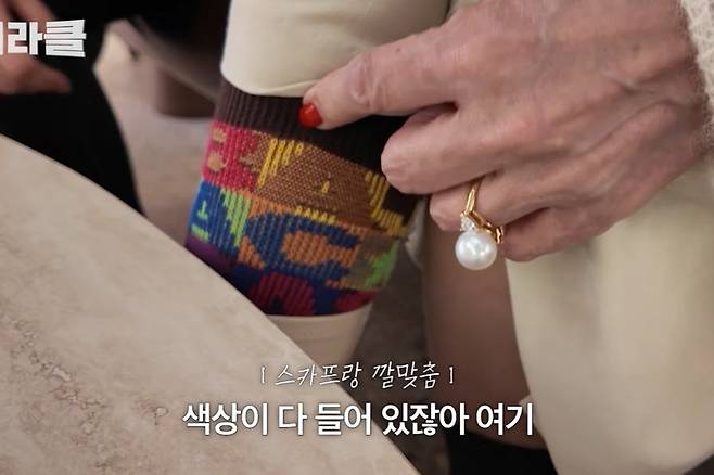 이어 "재킷만 입으면 단조로울 수 있는데, 스카프로 포인트를 줬다"라고 덧붙였다. 화려한 무늬의 스카프 역시 명품 H사의 것으로, 20년 된 제품이라고. 윤미라는 자신이 착용한 진주 목걸이와 반지도 자랑했다. 그는 "반지는 우리 엄마 거다. 우리 엄마가 진주 반지 좋아하셔서 끼셨다. 근데 돌아가셨으니까, 내가 끼는 거다"라고 설명해 눈길을 끌었다. 그의 남다른 패션 감각은 여기서 끝이 아니었다. 윤미라는 "양말까지 세트로 신었다"라며 알파벳이 적힌 화려한 양말을 보여줬다. 그는 "봄이 오니까, 화사하게 보이고 싶었다"라며 팬들을 향한 애정을 드러냈다.