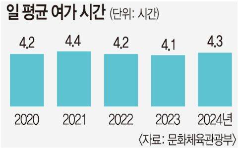 줄어든 노동시간이 ‘휴식’ 아닌 ‘부업’으로 흡수되는 흐름은 여가시간 데이터로 확인된다. 29일 문화체육관광부의 ‘국민여가활동조사’에 따르면 2024년 기준 평일·휴일을 합한 하루 평균 여가시간은 4.3시간이었다. 한국인의 여가시간은 최근 5년간 4시간 안팎에 머물러 있다. 2006년(3.8시간)보다 개선 폭이 크지 않을뿐더러, 주 52시간제가 전면 시행된 2021년(4.4시간)보다는 오히려 줄었다.