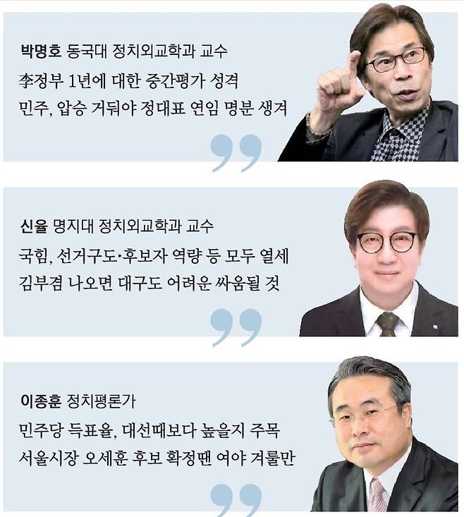 전반적 판세에 있어 3명의 전문가 모두 이 대통령 중간평가 성격이라 민주당에 기울 수밖에 없다고 봤다. 실제로 가장 최근 여론조사들을 보면 민주당 지지도는 40%대 중반인 데 비해 제1야당 국민의힘 지지도는 10%대로 주저앉았다.