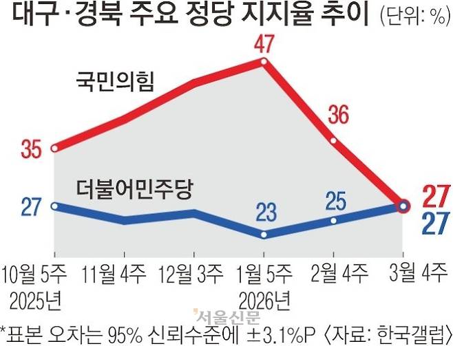 대구에서 나고 자랐다는 택시기사 황모(62)씨는 “국민의힘에 실망해서 이번 지방선거 때는 투표를 안 할 생각”이라면서도 “최근 민주당 지지율이 높다는데 막상 투표하면 국민의힘 후보가 당선되지 않을까 생각한다”고 말했다.