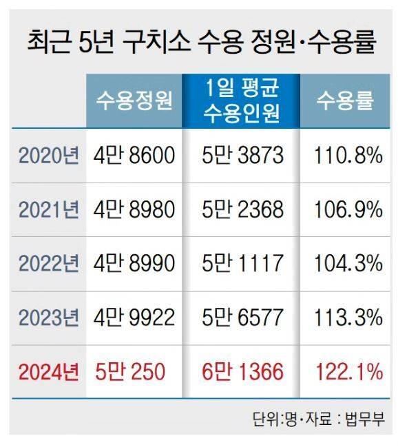 특히 1973년 문을 연 부산구치소는 전국에서 가장 노후화된 교정시설로 직원들마저 열악함을 호소할 정도다. 과밀수용 문제 또한 전국에서 가장 심각한 수준으로, 사고 발생 우려도 높은 곳으로 분류된다. 부산구치소의 수용률은 지난해 158.1%로, 전국 평균(128.5%)을 훌쩍 넘어 55개 교정시설 중 가장 높았다.