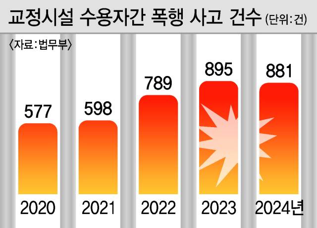 29일 법무부에 따르면 교정시설 내 수용자 간 폭행사건은 2020년 577건에서 2024년 881건으로 1.5배 늘어났다. 같은 기간 폭행 관련 입건·송치 건수도 361건에서 658건으로 2배 가까이 늘어난 것으로 나타났다.