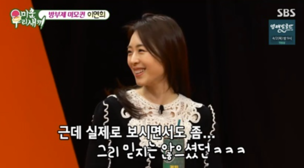 또 서장훈은 "남편이 결혼하기 전에 친구들에게 이연희와 사귄다고 밝히니까 아무도 안 믿었다고 한다. 너무 안 믿어서 실물을 보여주니까 그때부터 믿었다고 했다던데"라고 말하자, 이연희는 "실제로 보면서도 안 믿었던 것 같다"라고 말했다.