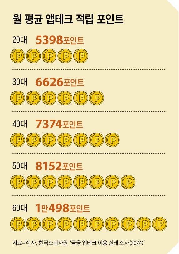 한국소비자원이 내놓은 ‘금융 앱테크 이용 실태 조사(2024년 7월)’에서도 2030보다 5060의 앱테크 ‘수확’이 훨씬 좋았다. 20대가 앱테크로 한 달에 5398포인트를 쌓을 때 60대는 1만498포인트를 적립하는 것으로 조사됐다.