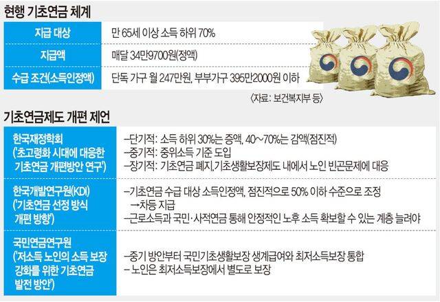 장기적으로는 기초연금 통폐합 필요성도 제기된다. 한국개발연구원(KDI)은 ‘기초연금 선정방식 개편 방향’ 보고서에서 “기초생활보장제도와 기초연금을 통합해 하나의 노인 범주형 공공부조 제도를 운용할 필요가 있다”고 짚었다. 재정학회는 노인가구의 특수성을 고려해 노인생계급여(가칭)를 신설하고 생계급여액을 증액하자는 제언도 내놨다.