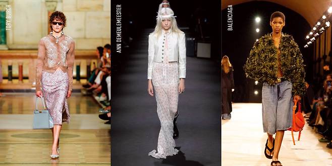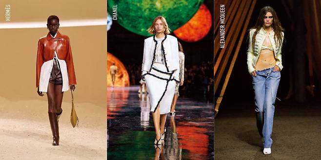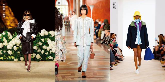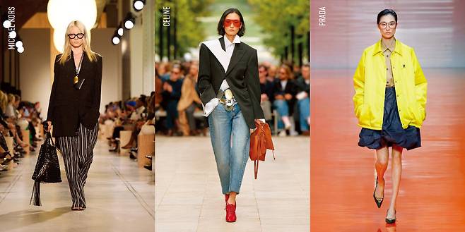 액세서리를 활용해 분위기의 변화를 꾀한 브랜드도 눈에 띈다. 마이클코어스는 엉덩이까지 내려오는 베이식한 재킷에 과감한 사이즈의 조개껍질 펜던트 목걸이를 착용했다. 블랙 재킷의 딱딱함을 중화시키기 위해 조형적인 골드 메탈을 활용한 것이다. 구조적인 테일러드 재킷 위에 청바지를 매치한 뒤 볼드한 벨트와 레드 힐을 더한 셀린의 룩에서는 창의성과 참신한 실험 정신이 엿보였다. 이 외에도 영감은 넘쳐난다. 베르사체는 블루 컬러의 오버사이즈 재킷을 레드, 민트 등과 조합한 컬러 플레이 룩으로 시선을 끌었다. 스텔라맥카트니는 장인 정신이 느껴지는 원피스 스타일의 재킷과 청바지로 패러독스 드레싱의 정석을 제시했다.